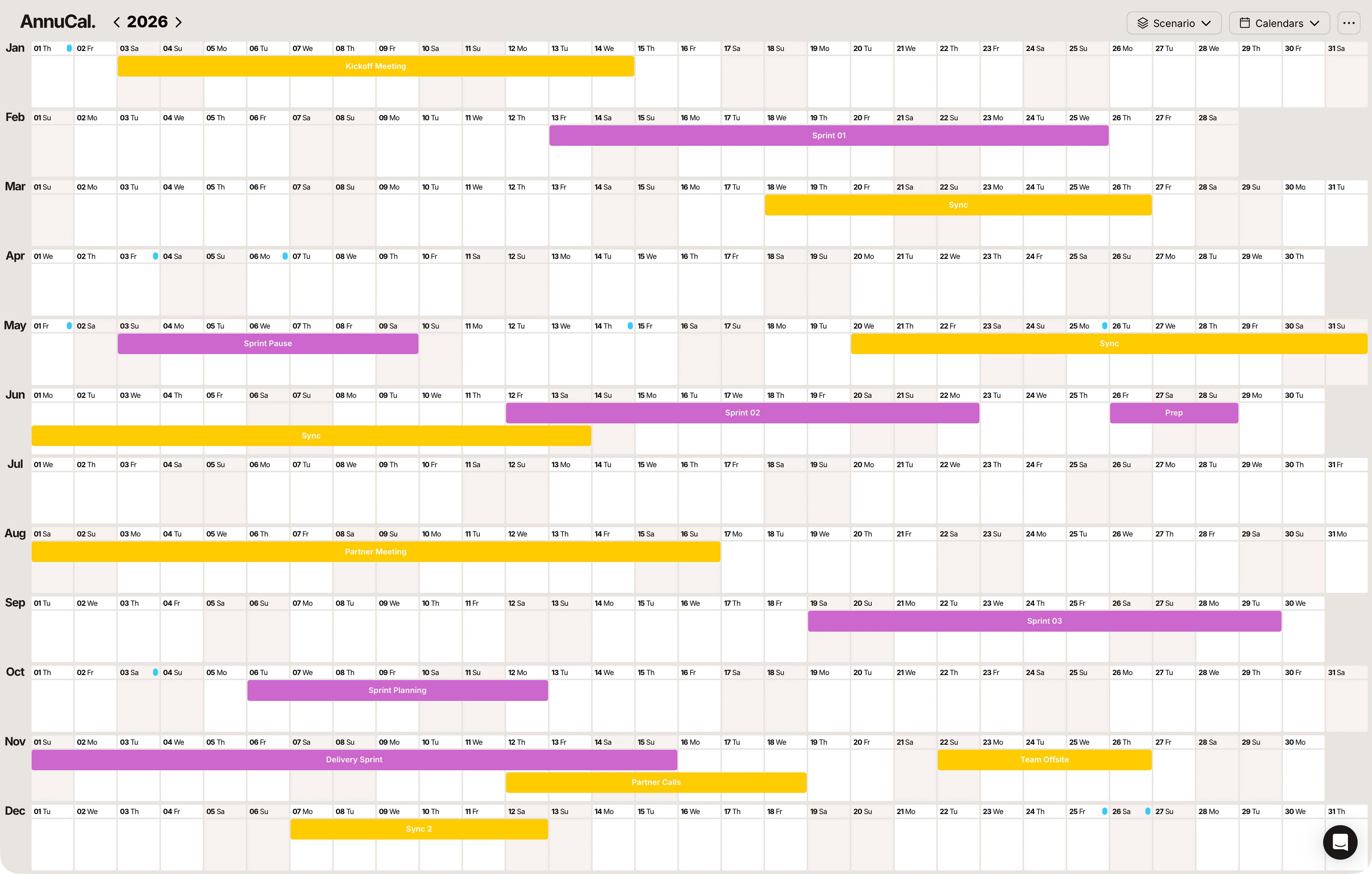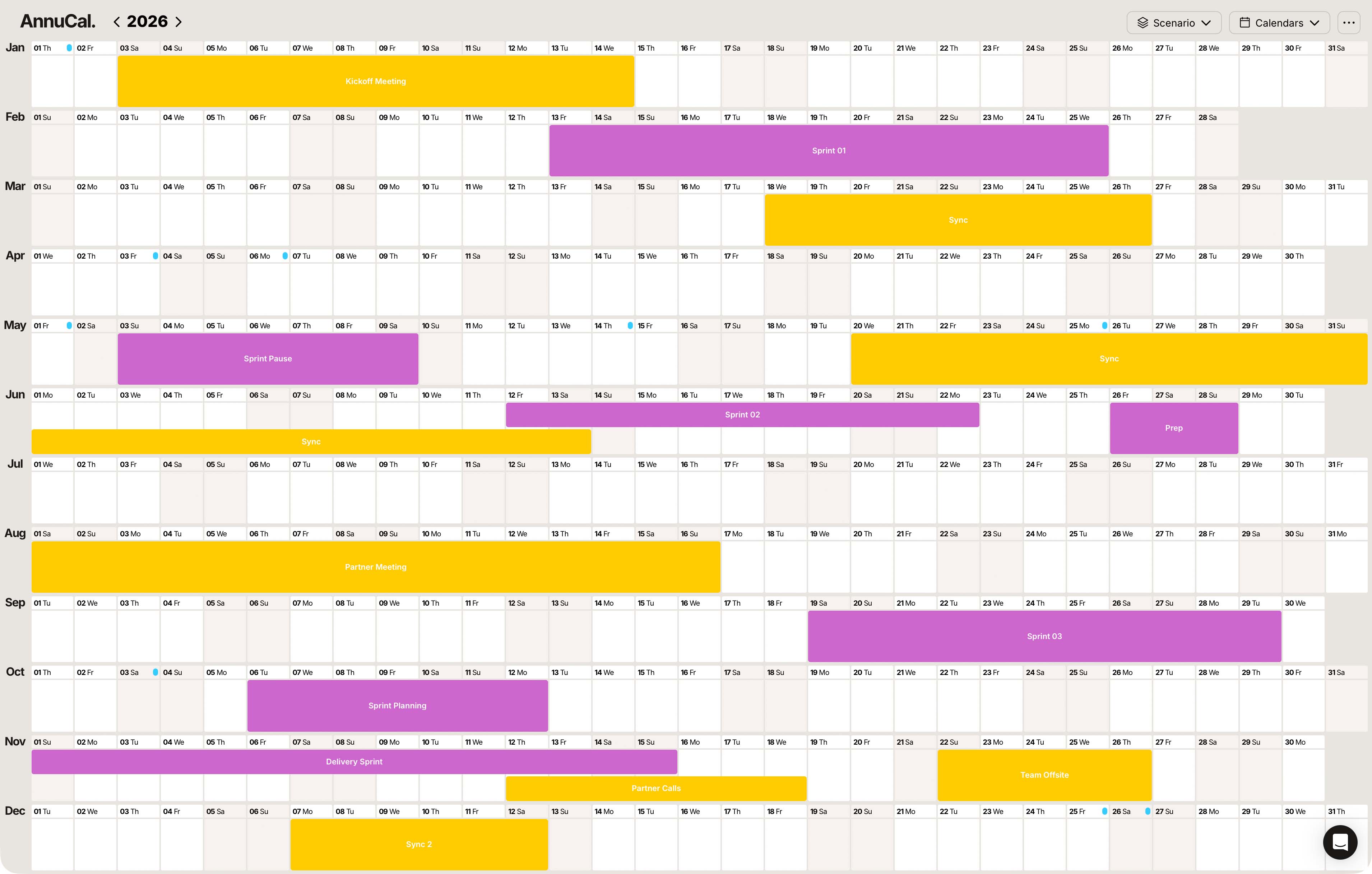 Stop planning long-term work in complex tables. AnnuCal turns dates, phases, and initiatives into a clean, visual yearly overview everyone understands at a glance.