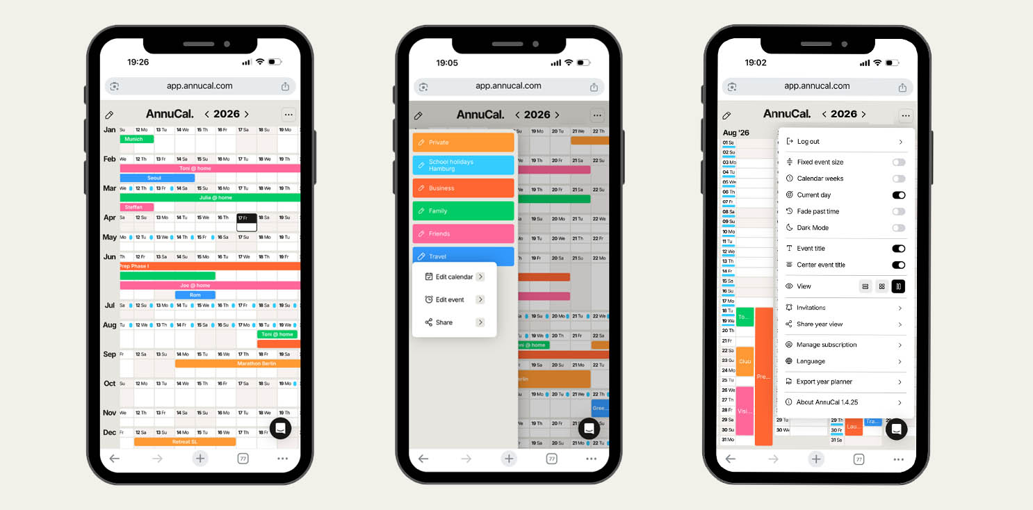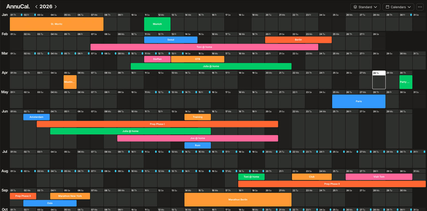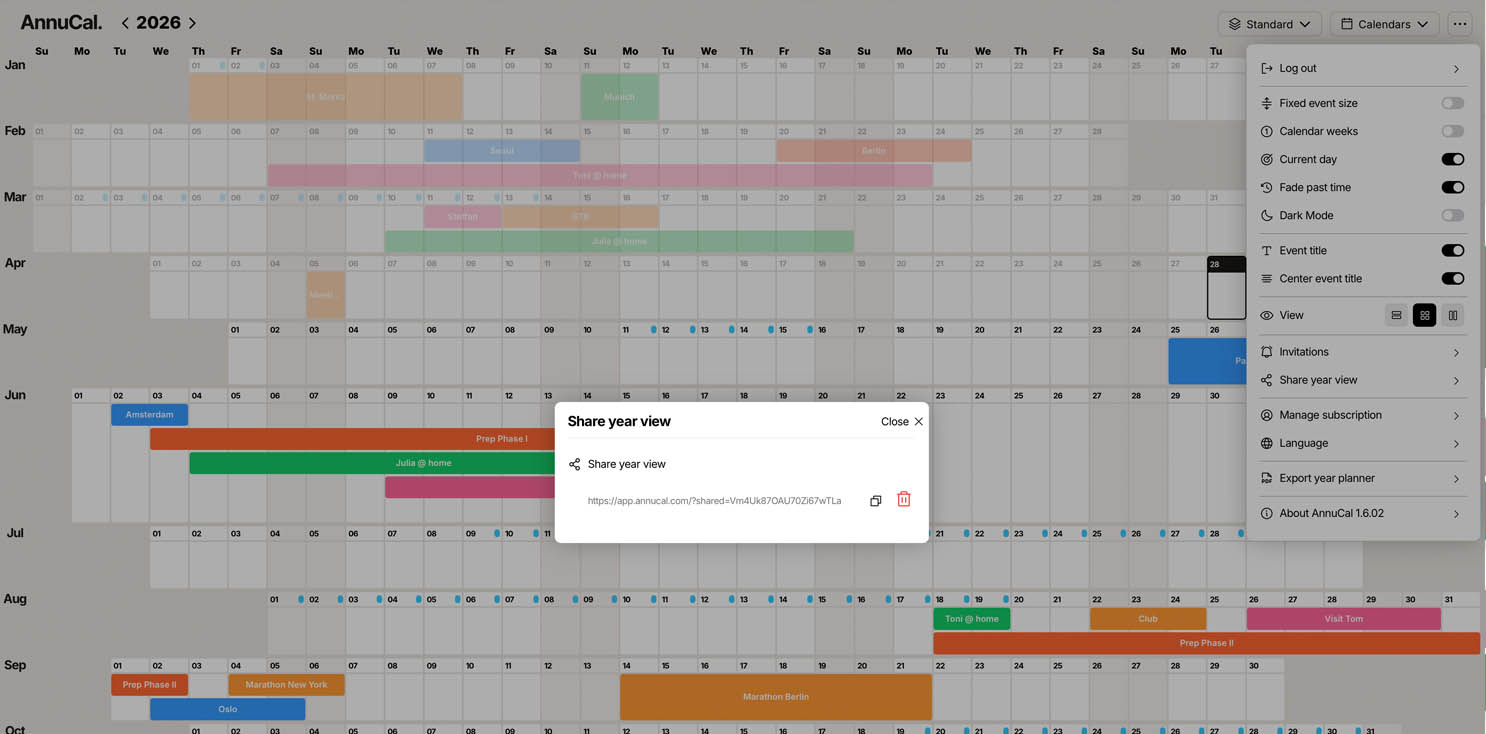 AnnuCal ermöglicht jetzt das Teilen der gesamten Jahresansicht per Link, führt die neue Wochenendansicht ein und bietet eine Funktion, mit der vergangene Zeit visuell in den Hintergrund tritt.