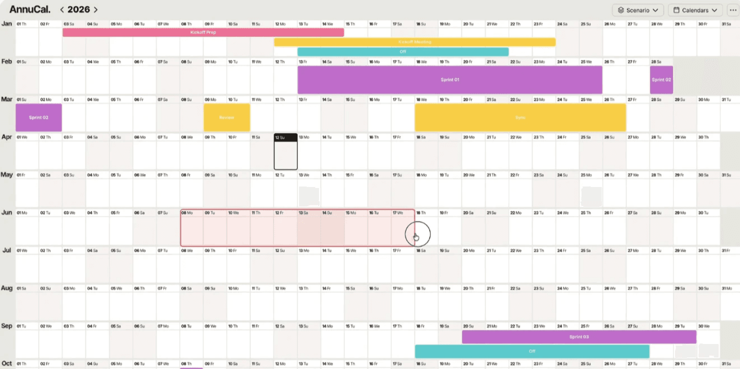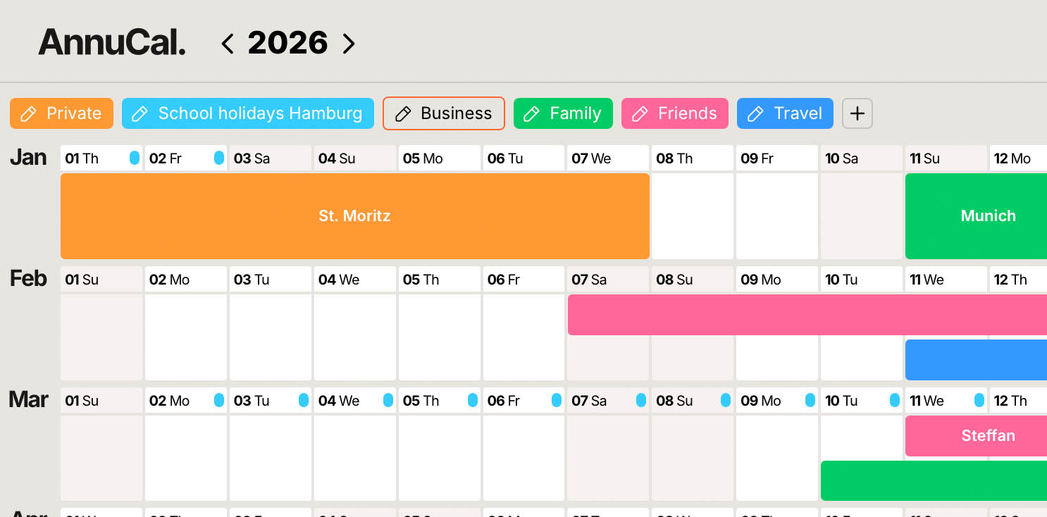 AnnuCal macht das Erstellen mehrtägiger Events jetzt deutlich schneller, führt Szenarien für separate Jahrespläne ein und bietet mit dem PDF-Export die Möglichkeit, die aktuelle Ansicht zu speichern oder auszudrucken.